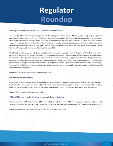 The FDIC will host listening sessions for bankers and other interested parties beginning in the fourth quarter of 2019. Each session will be