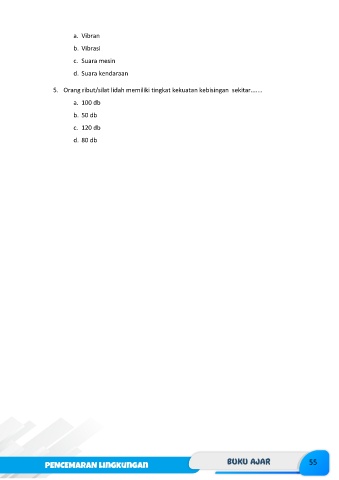 a. Vibran b. Vibrasi c. Suara mesin d. Suara kendaraan 5. Orang ribut/silat lidah memiliki tingkat kekuatan kebisingan sekitar....... a. 100 db b. 50 db c. 120 db d. 80 db 55