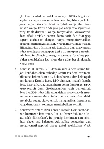 3. Konfliktual: antara BPD dengan kepala desa sering ter-