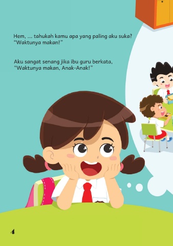 Hem, ... tahukah kamu apa yang paling aku suka? “Waktunya makan!” Aku sangat senang jika ibu guru berkata, “Waktunya makan, Anak-Anak!” 4