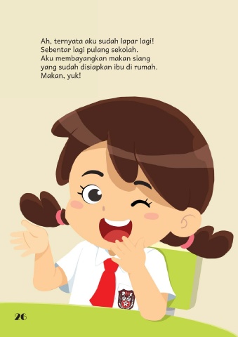Ah, ternyata aku sudah lapar lagi! Sebentar lagi pulang sekolah. Aku membayangkan makan siang yang sudah disiapkan ibu di rumah. Makan, yuk! 26