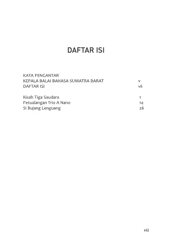 DAFTAR ISI KATA PENGANTAR KEPALA BALAI BAHASA SUMATRA BARAT v DAFTAR ISI vii Kisah Tiga Saudara 1 Petualangan Trio A Nano 14 Si Bujang Lenguang 26 vii