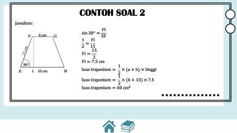 CONTOH SOAL 2 Jawaban: FI F 6 cm G sin 30° = EF 1 FI = 2 15 15 FI = 2 FI = 7.5 cm 30° 1 E I 10 cm H luas trapesium = × (a + b) × tinggi 2 1 luas trapesium = × (6 + 10) × 7.5 2 2 luas trapesium = 60 cm