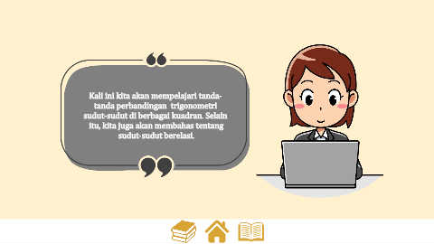 Kali ini kita akan mempelajari tanda- tanda perbandingan trigonometri sudut-sudut di berbagai kuadran. Selain itu, kita juga akan membahas tentang sudut-sudut berelasi.