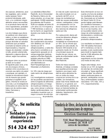 Esta información se tuvo en cuenta a la hora de analizar los resultados de este estu- dio, financiado por el Instituto de Salud Carlos III. El se- gundo trabajo está liderado por científicos franceses y brasileños y esta vez se cen- tra no en las muertes, sino en la posible relación entre riesgo de enfermedades car- diovasculares y cerebrovas- culares y consumo de productos ultraprocesados.
