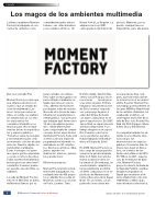 Moment Factory es más que una empresa de efectos vi- suales o que un estudio de creación multimedia. Las luces, las proyecciones en vídeo, el sonido, los elemen- tos arquitectónicos, los efec- tos especiales y los comandos informáticos se mezclan para ofrecer expe- riencias únicas en espectácu- los y espacios públicos. "Tomamos varias tecnologías y las integramos para crear un momento colectivo de gran emoción. Nuestro objetivo es transformar el ambiente. Como los magos, no quere- mos que la gente comprenda o conozca cómo lo hacemos. Todas nuestras herramientas buscan provocar emociones", cuenta Éric Fournier, produc- tor ejecutivo de esta firma ca- nadiense.