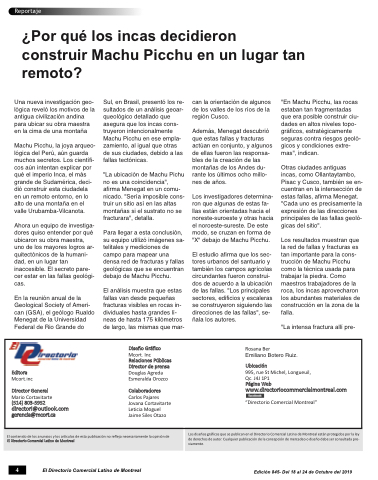 Sul, en Brasil, presentó los re- sultados de un análisis geoar- queológico detallado que asegura que los incas cons- truyeron intencionalmente Machu Picchu en ese empla- zamiento, al igual que otras de sus ciudades, debido a las fallas tectónicas.