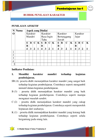 K (1) : peserta didik menunjukkan karakter mandiri yang kurang baik