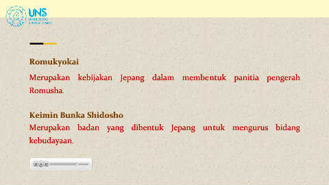 Romukyokai Merupakan kebijakan Jepang dalam membentuk panitia pengerah Romusha. Keimin Bunka Shidosho Merupakan badan yang dibentuk Jepang untuk mengurus bidang kebudayaan.