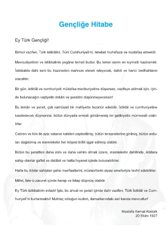 Birinci vazifen, Türk istiklâlini, Türk Cumhuriyeti’ni, ilelebet muhafaza ve müdafaa etmektir.