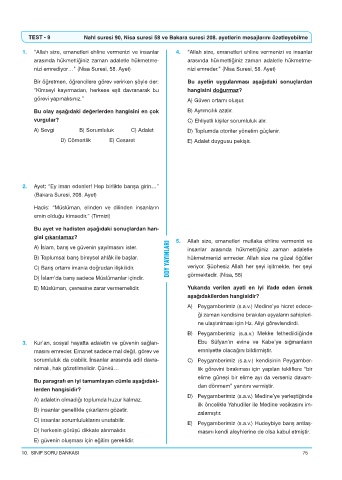 TEST - 9 Nahl suresi 90, Nisa suresi 58 ve Bakara suresi 208. ayetlerin mesajlarını özetleyebilme
