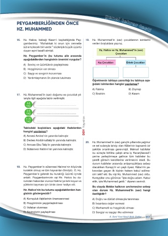 16. Hz. Hatice, bebeği Kasım’ı kaybettiğinde Pey- 19. Hz. Muhammed’in (sav) çocuklarının isimlerini