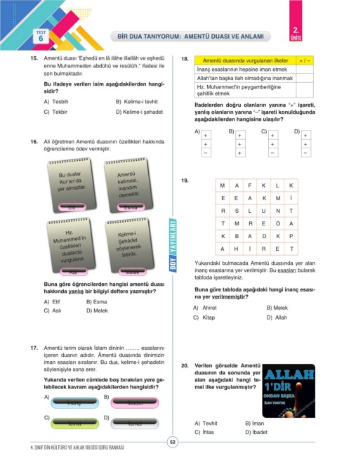 15. Amentü duası ‘Eşhedü en lâ ilâhe illallâh ve eşhedü 18. Amentü duasında vurgulanan ilkeler + / –