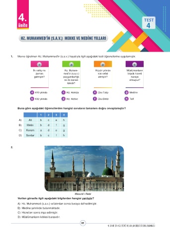 1. Merve öğretmen Hz. Muhammed’in (s.a.v.) hayatıyla ilgili aşağıdaki testi öğrencilerine uygulamıştır.