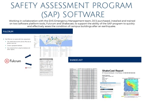 SAFETY ASSESSMENT PROGRAM (SAP) SOFTWAREWorking in collaboration with the EHS Emergency Management team, DCS purchased, installed and trained on two software platform tools, Fulcrum and Shakecast, to support the ability of the SAP program to quickly and effectively asses the condition of campus buildings after an earthquake.