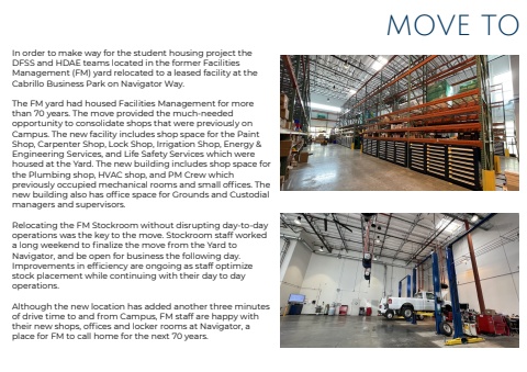 MOVE TO In order to make way for the student housing project the DFSS and HDAE teams located in the former Facilities Management (FM) yard relocated to a leased facility at the Cabrillo Business Park on Navigator Way. The FM yard had housed Facilities Management for more than 70 years. The move provided the much-needed opportunity to consolidate shops that were previously on Campus. The new facility includes shop space for the Paint Shop, Carpenter Shop, Lock Shop, Irrigation Shop, Energy & Engineering Services, and Life Safety Services which were housed at the Yard. The new building includes shop space for the Plumbing shop, HVAC shop, and PM Crew which previously occupied mechanical rooms and small offices. The new building also has office space for Grounds and Custodial managers and supervisors.Relocating the FM Stockroom without disrupting day-to-day operations was the key to the move. Stockroom staff worked a long weekend to finalize the move from the Yard to Navigator, and be open for business the following day. Improvements in efficiency are ongoing as staff optimize stock placement while continuing with their day to day operations.Although the new location has added another three minutes of drive time to and from Campus, FM staff are happy with their new shops, offices and locker rooms at Navigator, a place for FM to call home for the next 70 years.