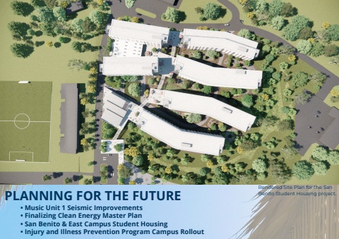 PLANNING FOR THE FUTURE%u2022 Music Unit 1 Seismic Improvements%u2022 Finalizing Clean Energy Master Plan%u2022 San Benito & East Campus Student Housing%u2022 Injury and Illness Prevention Program Campus RolloutRendered Site Plan for the San Benito Student Housing project.
