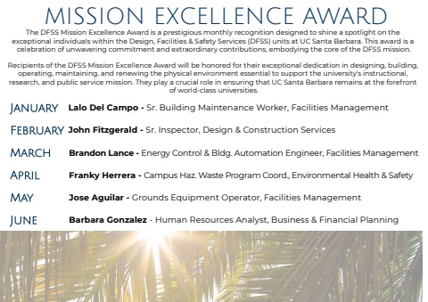 MISSION EXCELLENCE AWARDThe DFSS Mission Excellence Award is a prestigious monthly recognition designed to shine a spotlight on the exceptional individuals within the Design, Facilities & Safety Services (DFSS) units at UC Santa Barbara. This award is a celebration of unwavering commitment and extraordinary contributions, embodying the core of the DFSS mission.Recipients of the DFSS Mission Excellence Award will be honored for their exceptional dedication in designing, building, operating, maintaining, and renewing the physical environment essential to support the university's instructional, research, and public service mission. They play a crucial role in ensuring that UC Santa Barbara remains at the forefront of world-class universities.Lalo Del Campo - Sr. Building Maintenance Worker, Facilities ManagementJohn Fitzgerald - Sr. Inspector, Design & Construction ServicesBrandon Lance - Energy Control & Bldg. Automation Engineer, Facilities ManagementFranky Herrera - Campus Haz. Waste Program Coord., Environmental Health & SafetyJose Aguilar - Grounds Equipment Operator, Facilities ManagementBarbara Gonzalez - Human Resources Analyst, Business & Financial Planning