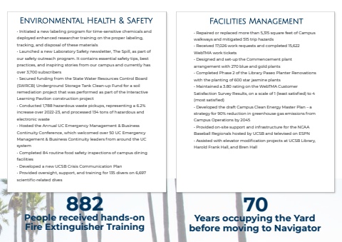 Environmental Health & Safety%u2022 Initiated a new labeling program for time-sensitive chemicals and deployed enhanced researcher training on the proper labeling, tracking, and disposal of these materials%u2022 Launched a new Laboratory Safety newsletter, The Spill, as part of our safety outreach program. It contains essential safety tips, best practices, and inspiring stories from our campus and currently has over 3,700 subscribers%u2022 Secured funding from the State Water Resources Control Board (SWRCB) Underground Storage Tank Clean-up Fund for a soil remediation project that was performed as part of the Interactive Learning Pavilion construction project%u2022 Conducted 1,788 hazardous waste pickups, representing a 6.2% increase over 2022-23, and processed 134 tons of hazardous and electronic waste%u2022 Hosted the Annual UC Emergency Management & Business Continuity Conference, which welcomed over 50 UC Emergency Management & Business Continuity leaders from around the UC system%u2022 Completed 84 routine food safety inspections of campus dining facilities%u2022 Developed a new UCSB Crisis Communication Plan%u2022 Provided oversight, support, and training for 135 divers on 6,697 scientific-related divesFacilities Management%u2022 Repaired or replaced more than 5,315 square feet of Campus walkways and mitigated 515 trip hazards%u2022 Received 17,026 work requests and completed 15,622 WebTMA work tickets%u2022 Designed and set-up the Commencement plant arrangement with 270 blue and gold plants %u2022 Completed Phase 2 of the Library Paseo Planter Renovations with the planting of 600 star jasmine plants%u2022 Maintained a 3.80 rating on the WebTMA Customer Satisfaction Survey Results, on a scale of 1 (least satisfied) to 4 (most satisfied)%u2022 Developed the draft Campus Clean Energy Master Plan %u2013 a strategy for 90% reduction in greenhouse gas emissions from Campus Operations by 2045%u2022 Provided on-site support and infrastructure for the NCAA Baseball Regionals hosted by UCSB and televised on ESPN%u2022 Assisted with elevator modification projects at UCSB Library, Harold Frank Hall, and Bren Hall88270People received hands-on Fire Extinguisher TrainingYears occupying the Yard before moving to Navigator