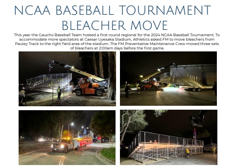 This year the Gaucho Baseball Team hosted a first round regional for the 2024 NCAA Baseball Tournament. To accommodate more spectators at Caesar Uyesaka Stadium, Athletics asked FM to move bleachers from Pauley Track to the right field area of the stadium. The FM Preventative Maintenance Crew moved three sets of bleachers at 2:00am days before the first game.NCAA BASEBALL TOURNAMENT BLEACHER MOVE