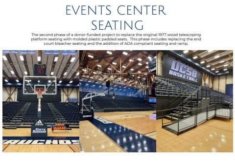 EVENTS CENTER SEATINGThe second phase of a donor-funded project to replace the original 1977 wood telescoping platform seating with molded plastic padded seats. This phase includes replacing the end court bleacher seating and the addition of ADA compliant seating and ramp.