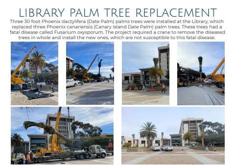 library palm tree replacementThree 30 foot Phoenix dactylifera (Date Palm) palms trees were installed at the Library, whichreplaced three Phoenix canariensis (Canary Island Date Palm) palm trees. These trees had afatal disease called Fusarium oxysporum. The project required a crane to remove the diseasedtrees in whole and install the new ones, which are not susceptible to this fatal disease.