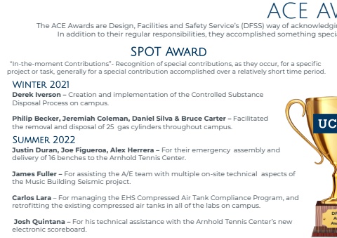 ACE AWSPOT AwardThe ACE Awards are Design, Facilities and Safety Service%u2019s (DFSS) way of acknowledginIn addition to their regular responsibilities, they accomplished something specia%u201cIn-the-moment Contributions%u201d- Recognition of special contributions, as they occur, for a specificproject or task, generally for a special contribution accomplished over a relatively short time period.Winter 2021Summer 2022Justin Duran, Joe Figueroa, Alex Herrera %u2013 For their emergency assembly anddelivery of 16 benches to the Arnhold Tennis Center.James Fuller %u2013 For assisting the A/E team with multiple on-site technical aspects ofthe Music Building Seismic project. Carlos Lara %u2013 For managing the EHS Compressed Air Tank Compliance Program, andretrofitting the existing compressed air tanks in all of the labs on campus.Josh Quintana %u2013 For his technical assistance with the Arnhold Tennis Center%u2019s newelectronic scoreboard.Derek Iverson %u2013 Creation and implementation of the Controlled SubstanceDisposal Process on campus. Philip Becker, Jeremiah Coleman, Daniel Silva & Bruce Carter %u2013 Facilitatedthe removal and disposal of 25 gas cylinders throughout campus.DFACAw