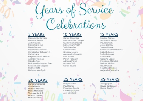 20 YEARS25 YEARSMaria AlvarezPaul FisherFrancisco GarciaKimberly GaytanJoel GonzalezBarbara GonzalezGloria MarinMatilde MartinezMaria MendozaThomas Stark JrMartha TejedaMaria Valencia5 YEARSMario Avila-CornejoNicholas BruceJustin DuranFrank Galvan JrMarie GenslerRaymond GonzalesChristopher Johnson JrCarlos LaraEdlyn Linares CisnerosAnthony RamosClaudia RealFeliciano Rodriguez BaezFabian Salas SalgadoRodney TateNicholas Van Eyck10 YEARSCarlos CifuentesLeonardo Del CampoGuillermo GonzalezLiana KhammashJulio MendezSteven MillerGregory MooreAlessandro MorettoLuis NanezPerrin PellegrinAdriana PerezAndrew TaffCarlos Zavala15 YEARSMarizol ArenasAscencion ArroyoPaul BartschJesse BickleyJames CaesarOranda Carrillo HerreraLizbeth CeronJulio GutierrezDaniel HartCatalina LopezFrancisco MendezMelissa MolinaRaul MunozFaustino RevelesAlejandro Saavedra35 YEARSAli AghayanReyes CardenasRudra SinghYears of ServiceCelebrations