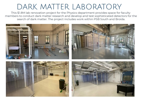 DARK MATTER LABORATORY This $1.8M lab renovation project for the Physics department provides space for facultymembers to conduct dark matter research and develop and test sophisticated detectors for thesearch of dark matter. The project includes work within PSB South and Broida.