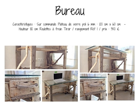 Bureau Caractéristiques : Sur commande Plateau de verre poli 6 mm : 120 cm x 60 cm - Hauteur 80 cm Roulettes à frein Tiroir / rangement Réf 1 / prix : 350 €