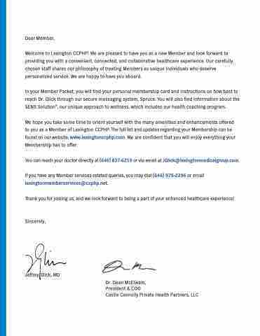 Welcome to Lexington CCPHP! We are pleased to have you as a new Member and look forward to providing you with a convenient, connected, and collaborative healthcare experience. Our carefully chosen staff shares our philosophy of treating Members as unique individuals who deserve personalized service. We are happy to have you aboard.