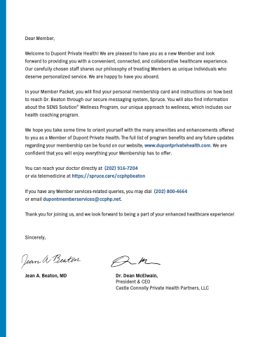 We hope you take some time to orient yourself with the many amenities and enhancements offered to you as a Member of Dupont Private Health. The full list of program benefits and any future updates regarding your membership can be found on our website, www.dupontprivatehealth.com. We are confident that you will enjoy everything your Membership has to offer.