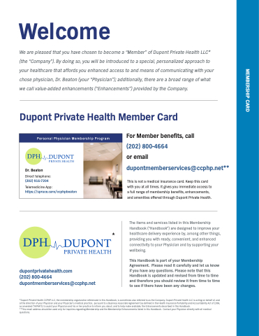*Dupont Private Health CCPHP LLC, the membership organization referenced in this Handbook, is sometimes also referred to as the Company. Dupont Private Health LLC is acting on behalf of, and at the direction of your Physician and your Physician’s medical practice, pursuant to a Business Associate Agreement (as defined in the Health Insurance Portability and Accountability Act of 1996, as amended (“HIPAA”)), to assist your Physician and his or her practice to inform you about, and to help make available, the Enhancements described in this Handbook.