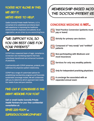 of legal compliance conversion and marketing experts that have collectively transitioned and enhanced hundreds of practices A partnership with CCPHP preserves protects and optimizes the physician-patient relationship CCPHP has a a a range of customized options for establishing membership programs and financially sustainable concierge models We will collaborate with you to determine which approach best meets the needs of you you and your practice Find out if concierge is the right medicine for you!!