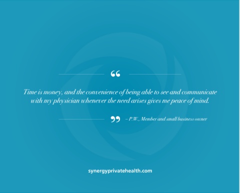 “ Time is money, and the convenience of being able to see and communicate with my physician whenever the need arises gives me peace of mind. – P.W., Member and small business owner “ synergyprivatehealth.com