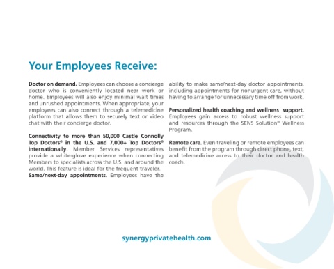 Doctor on demand. Employees can choose a concierge ability to make same/next-day doctor appointments,