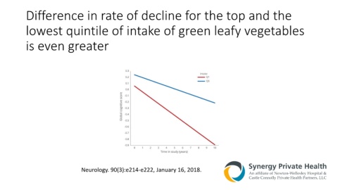 Difference in rate of decline for the top and the lowest quintile of intake of green leafy vegetables is even greater Neurology. 90(3):e214-e222, January 16, 2018.