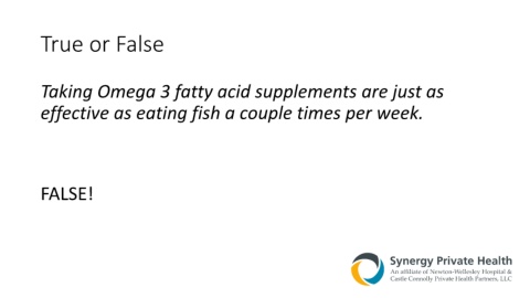True or False Taking Omega 3 fatty acid supplements are just as effective as eating fish a couple times per week. FALSE!