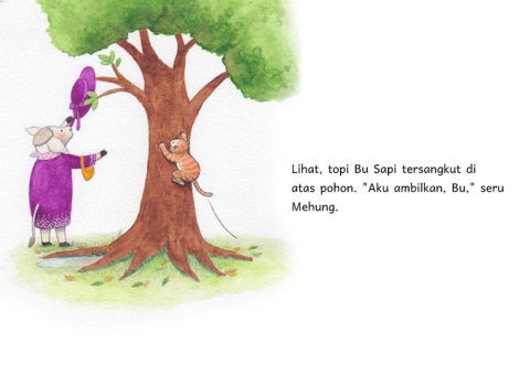 Lihat, topi Bu Sapi tersangkut di atas pohon. "Aku ambilkan, Bu," seru Mehung.