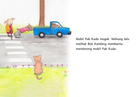 Mobil Pak Kuda mogok. Mehung lalu melihat Bok Kambing membantu mendorong mobil Pak Kuda.