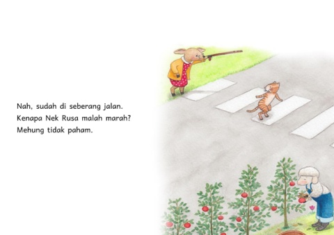Nah, sudah di seberang jalan. Kenapa Nek Rusa malah marah? Mehung tidak paham.