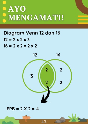 Diagram Venn 12 dan 16 12 = 2 x 2 x 3 16 = 2 x 2 x 2 x 2 12 16 2 2 3 2 2 FPB = 2 X 2 = 4 42