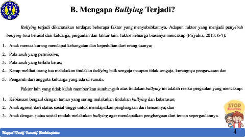 Bullying terjadi dikarenakan terdapat beberapa faktor yang menyebabkannya. Adapun faktor yang menjadi penyebab