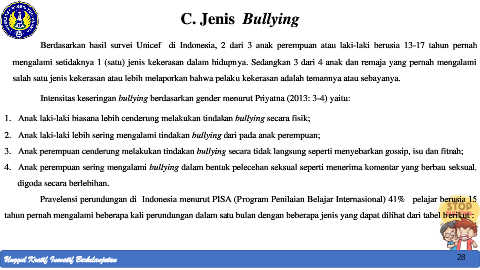 Pravelensi perundungan di Indonesia menurut PISA (Program Penilaian Belajar Internasional) 41% pelajar berusia 15