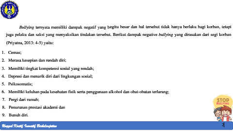 Bullying ternyata memiliki dampak negatif yang begitu besar dan hal tersebut tidak hanya berlaku bagi korban, tetapi