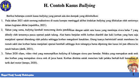 1. Pada tahun 2021 salah seorang mahasiswa di suatu kampus meninggal akibat tindakan bullying yang dilakukan oleh seniornya