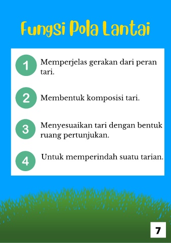 Fungsi Pola Lantai Memperjelas gerakan dari peran tari. Membentuk komposisi tari. Menyesuaikan tari dengan bentuk ruang pertunjukan. Untuk memperindah suatu tarian. 7