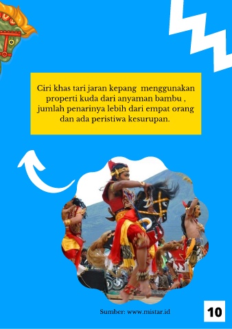 Ciri khas tari jaran kepang menggunakan properti kuda dari anyaman bambu , jumlah penarinya lebih dari empat orang dan ada peristiwa kesurupan. 10 Sumber: www.mistar.id