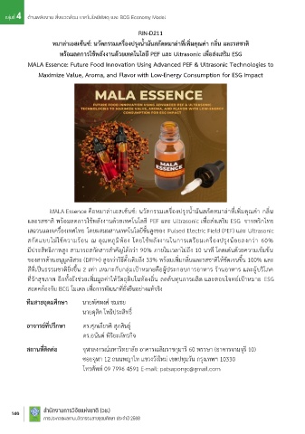 MALA Essence คือหมำล่ำเอสเซ้นซ์: นวัตกรรมเครื่องปรุงน้ ำมันสกัดหมำล่ำที่เพิ่มคุณค่ำ กลิ่น PEP-Brew คือปุ๋ยน้ ำชวภำพที่พัฒนำจำกยีสต์เหลือทิ้งในอุตสำหกรรมเบียร์ โดยใชกระบวนกำร
