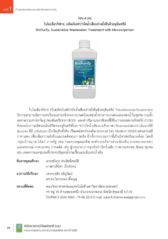 ไบโอเพียวริฟำย เป็นผลิตภัณฑ์บ ำบัดน ำเสียอย่ำงยั่งยืนด้วยจุลินทรีย์ Pseudomonas fluorescens เกสรเทียมจำกเนื้อไก่เป็นอำหำรเสริมผึ้งพันธุ์ที่ผลิตจำกเนื้อไก่ที่ผ่ำนกำรปรับสภำพด้วยเอนไซม์